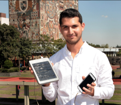 Alejandro Crespo, estudiante de séptimo semestre de la licenciatura en Ingeniería Eléctrica Electrónica en la Facultad de Ingeniería de la UNAM creó un cargador solar portátil para dispositivos móviles, que ya vende en su empresa TechStem.