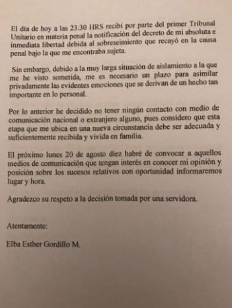 Durante la lectura de un comunicado hecha desde las escalinatas de la casa ubicada en Polanco, donde Gordillo era mantenida en prisión domiciliaria, Del Toro indicó que el Primer Tribunal Unitario emitió anoche la resolución, por lo que Gordillo ya se encuentra en libertad, en otra casa acompañada de familiares.