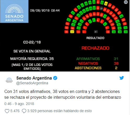 Sobre esta ley, que permitiría a las mujeres interrumpir el embarazo en las primeras 14 semanas de gestación, 38 senadores votaron en contra, 31 a favor y hubo 2 abstenciones.