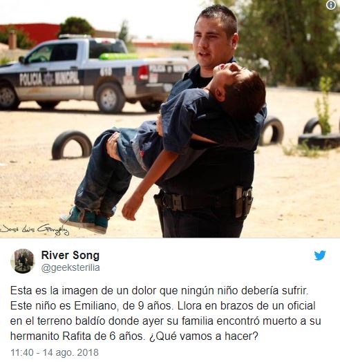 ‘¡Quiero a mi hermano!’, ‘¡Quiero a mi hermano!’, repetía una y otra vez el pequeño Luis mientras que un agente de la policía municipal conmovido por la escena decidió tomar en brazos al niño y alejarlo de la escena donde los peritos especializados en la escena del crimen retiraban el cuerpo inerte del menor, citó El diario de Chihuahua.