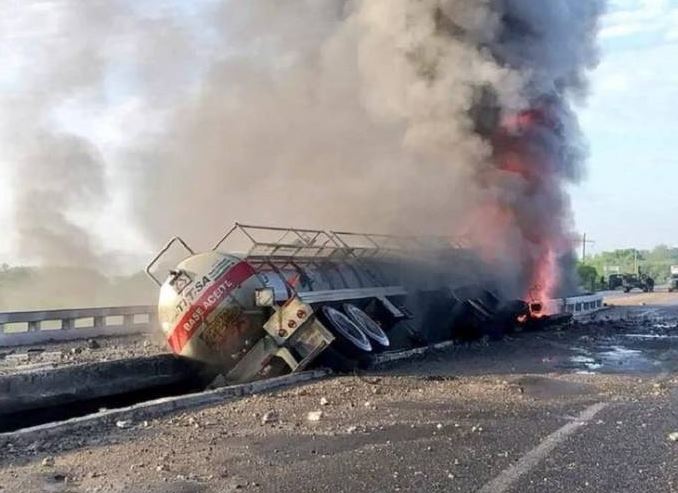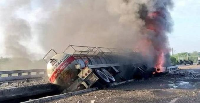 SAN FERNANDO, Tam.- Una pipa de doble remolque cargada con 70 mil litros de aceite base, se impactó contra el muro de contención de un puente en la carretera Victoria-Matamoros, incendiándose, provocando el cierre de dicha rúa en ambos sentidos.