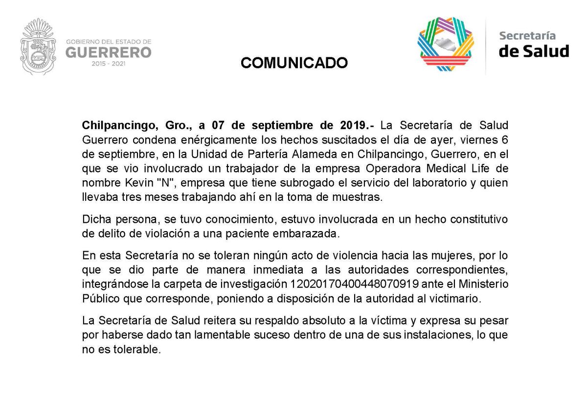La Secretaría de Salud de Guerrero informó que ayer un trabajador de la empresa Operadora Medical Life violó a una paciente embarazada en las instalaciones de la Unidad de Partería Alameda de la ciudad.